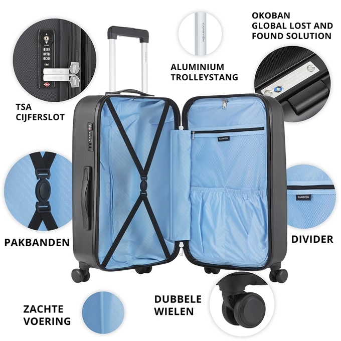 De CarryOn Skyhopper 67cm is een uitermate sterke koffer gemaakt van 50% ABS en 50% polycarbonaat. De koffers zijn kenmerkend door de zeer goede prijs/kwalitietsverhouding. De koffer beschikt over 4 wielen die elk 360 graden kunnen draaien. De binnenkant van de koffer is uitgerust met pakriemen en een tussenvak met extra vakken.